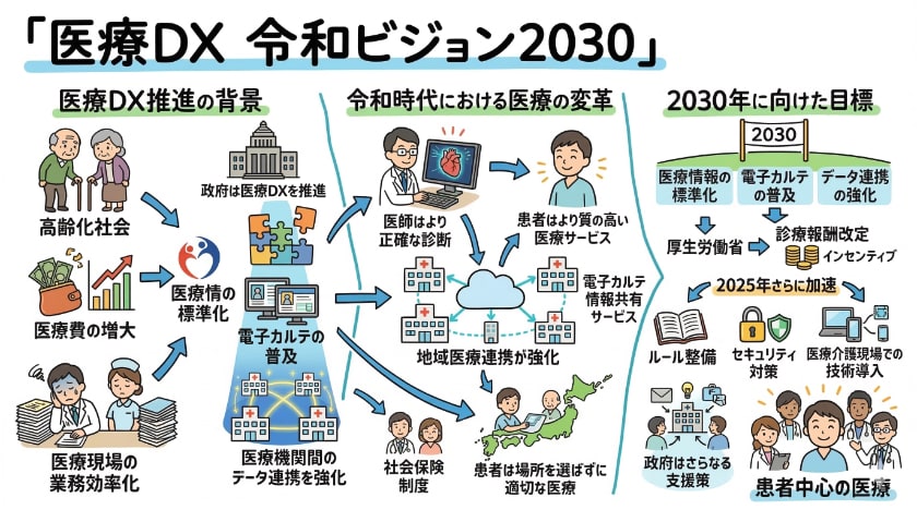 2030年に向けた目標として、医療DX令和ビジョン2030では、医療情報の標準化、電子カルテの普及、そして医療機関間のデータ連携の強化が掲げられています。